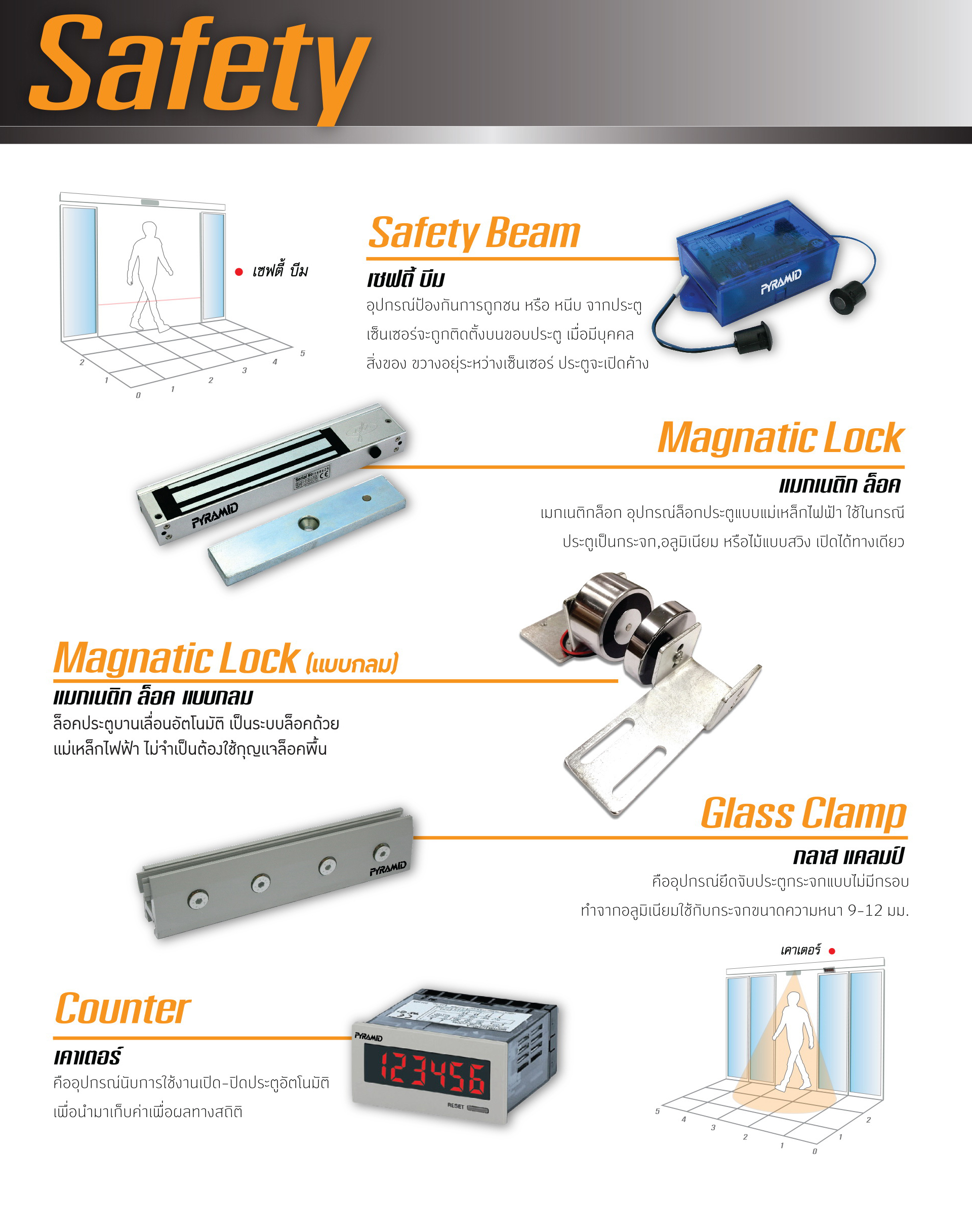 ใช้สำหรับหนีบกระจกบานเปลือย บานกระจกไม่ต้องเจาะรู ความยาว 24 เซนติเมตร 1 บาน/คู่ หากประตูกว้างเกิน 1.50 เมตร ต้องเพิ่มอีก 1 ชิ้น เพื่อช่วยเฉลี่ยน้ำหนักของบานประตูอัตโนมัติ